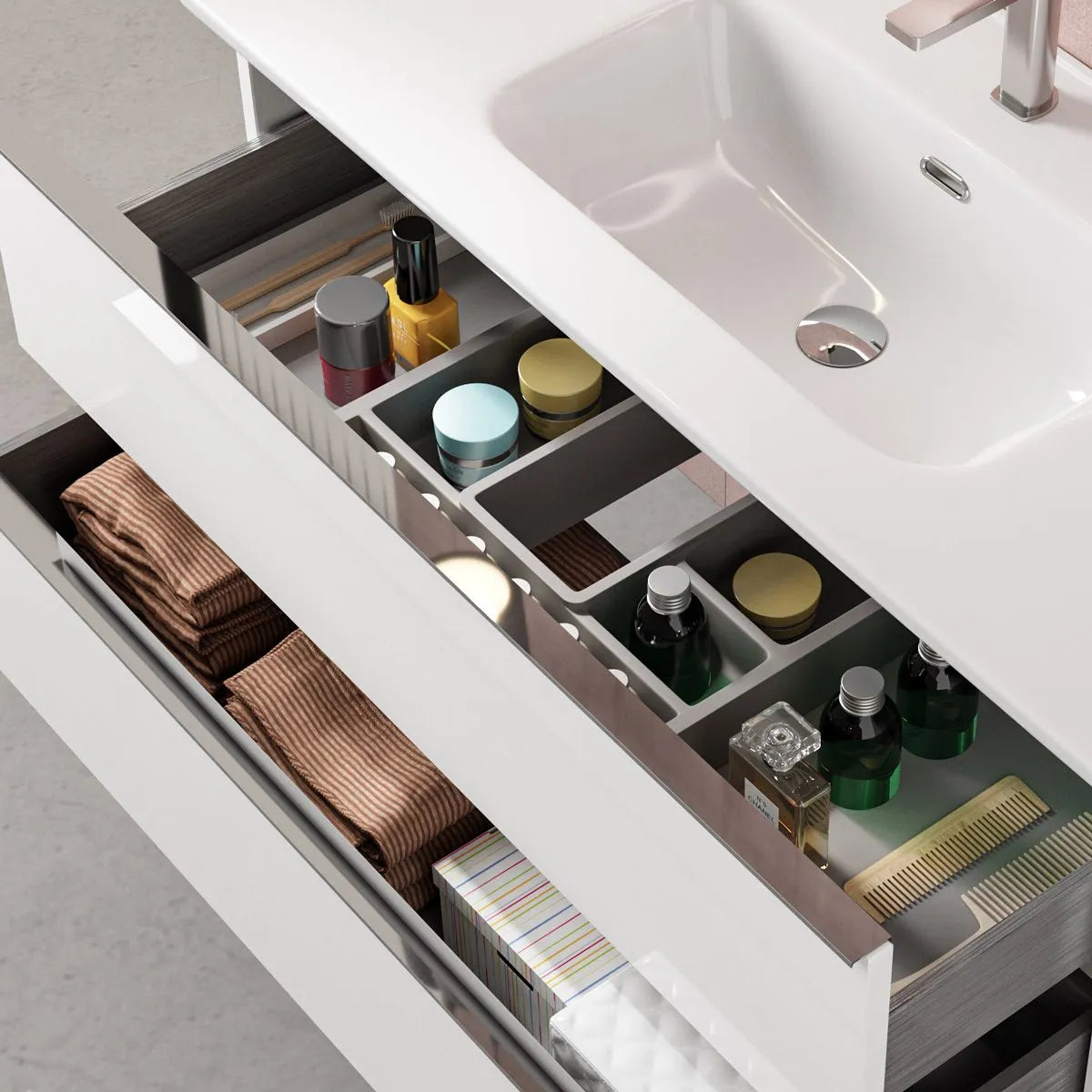 For dig, der ønsker en endnu mere fleksibel løsning, er det også muligt at kombinere to 60 cm kommoder for at skabe et møbel på 120 cm, som kan kombineres med vores dobbelte håndvaske på 120 cm. Dette giver ikke blot et elegant og ensartet udseende, men også fire separate skuffer i stedet for to, hvilket gør det nemmere at organisere dine ejendele.