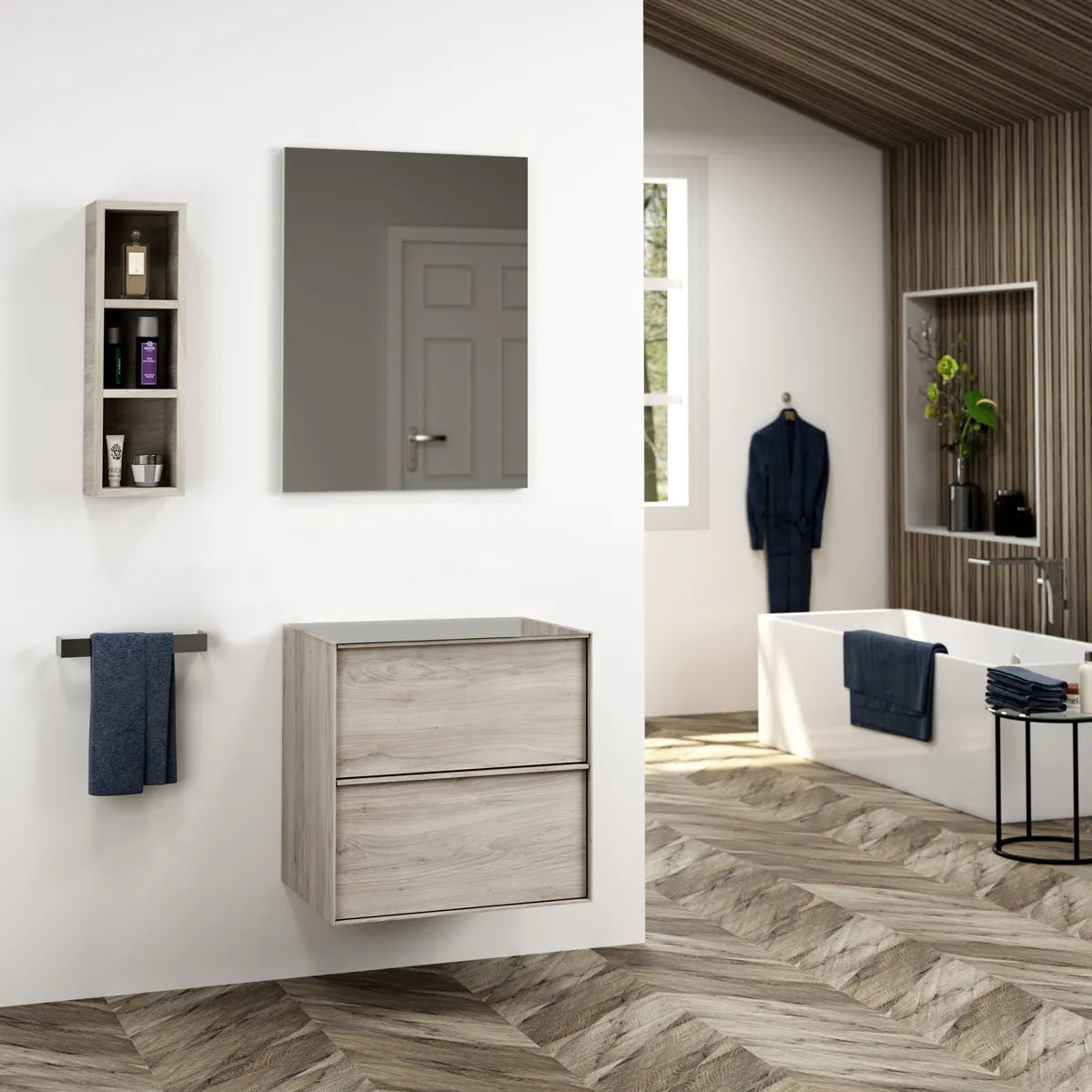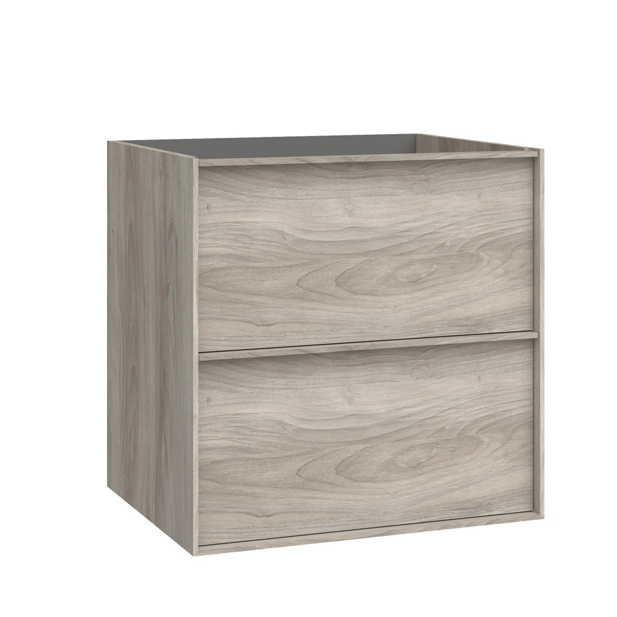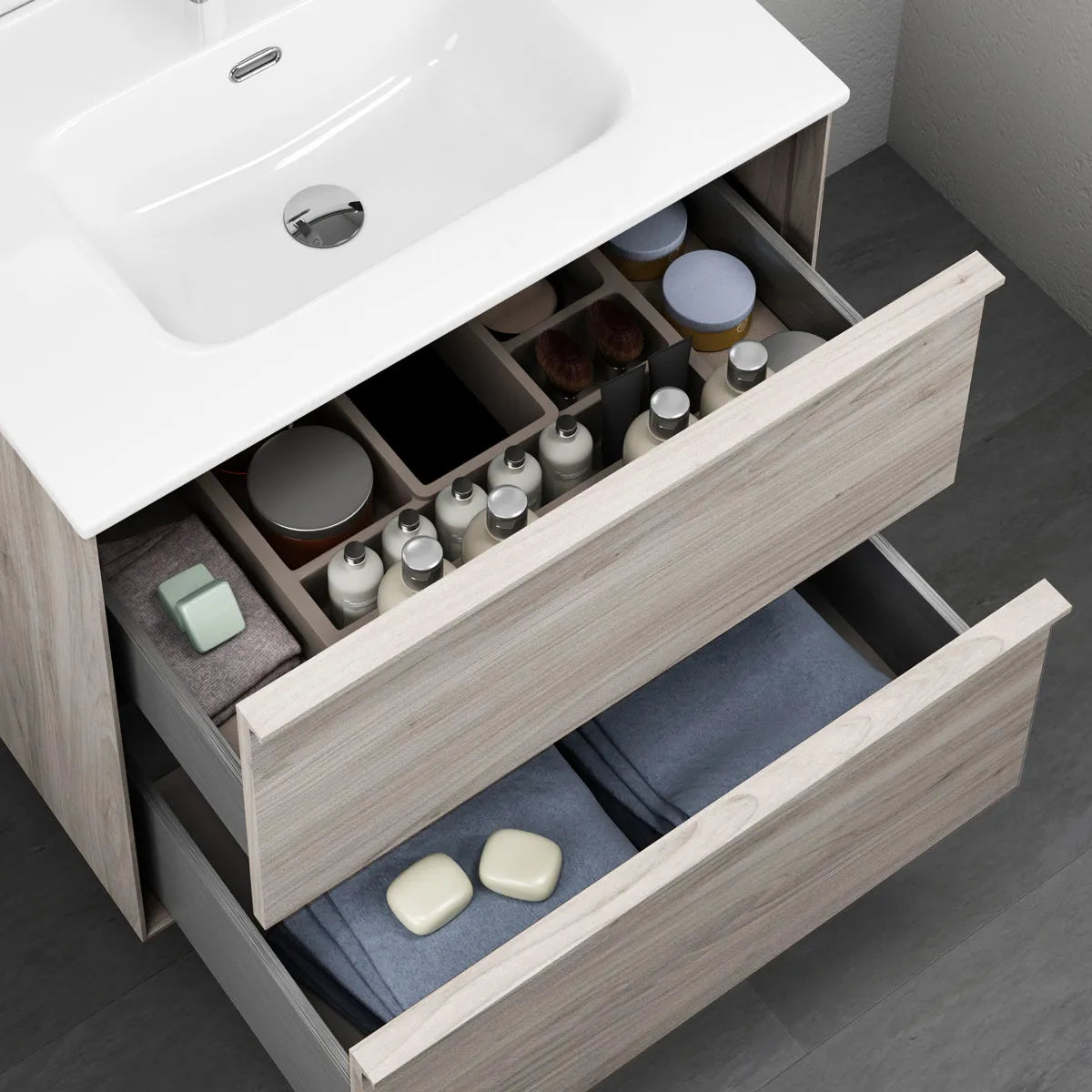 Kommoderne i serien fås i to bredder, 60 cm og 80 cm, hvilket giver fleksibilitet til forskellige badeværelsesstørrelser. Med en dybde på 46 cm og en højde på 59 cm tilbyder de rigelig opbevaringsplads uden at dominere rummet. De er udstyret med to rummelige skuffer med soft-close mekanismer, hvilket gør dem både praktiske og støjsvage. Skuffernes grebskanter, fremstillet i samme materiale og finish som resten af møblet, bidrager til et ensartet og moderne udseende.