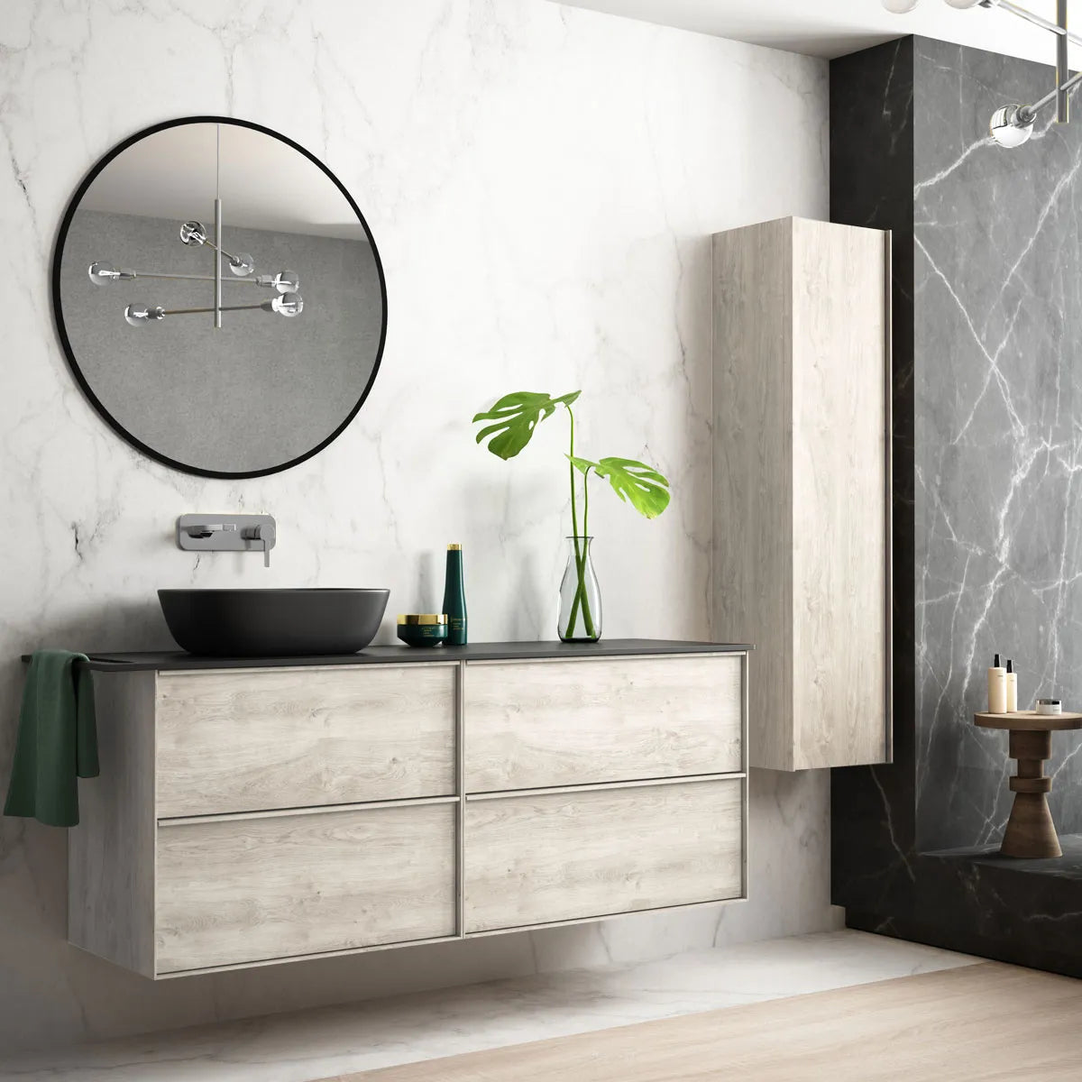 Tenfors Nordlig er en høj-kvalitets og elegant møbelserie, der kombinerer stil og funktion, perfekt til moderne badeværelser. Serien omfatter både kommoder og højskabe i træimitation eller matlakeret overflade, som tilsammen tilbyder en harmonisk og ensartet løsning til badeværelsesindretning. Med sit tidløse design og gennemtænkte detaljer skaber Tenfors Nordlig en afslappet og eksklusiv atmosfære.