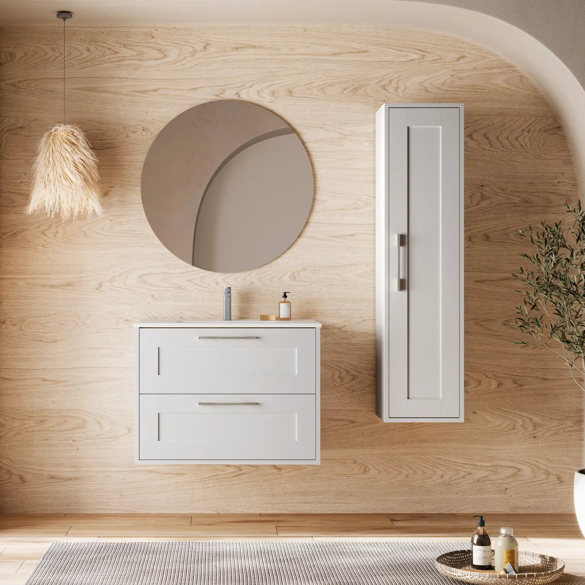 Kan kombineres med vask i Solid Surface i matchende farve eller klassisk hvid, samt blandingsbatteri, bundventil, vandlås og spejl.