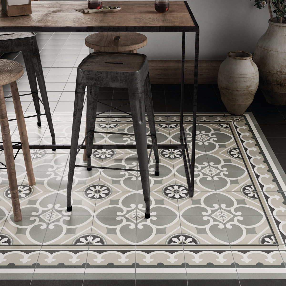 Billederne viser eksempler på, hvordan dekor-, kant- og hjørnefliser kan kombineres for at danne en helhed. Serien giver dig stor fleksibilitet til at tilpasse mønstret efter rummets størrelse og karakter – fra små områder til store gulvflader, hvor designet virkelig kommer til sin ret. Med Atelier får du et både praktisk og æstetisk gulv, der holder i mange år fremover – perfekt til dig, der ønsker at skabe en fornemmelse af århundredeskifte i hjemmet.