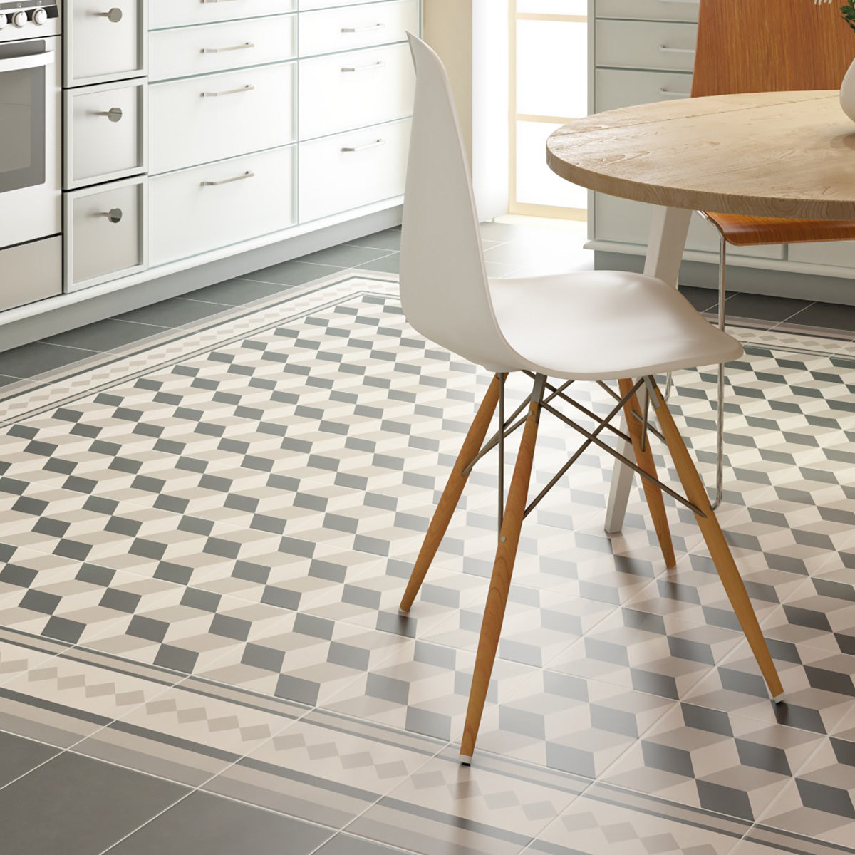 Ved at kombinere kantflisen med Paris dekor- og hjørnefliser opnår du et helhedsindtryk, der minder om klassiske århundredeskiftegulve, men med et moderne og geometrisk udtryk. Perfekt til hjemmets centrale rum eller som en effektfuld detalje i entréer og udestuer.
