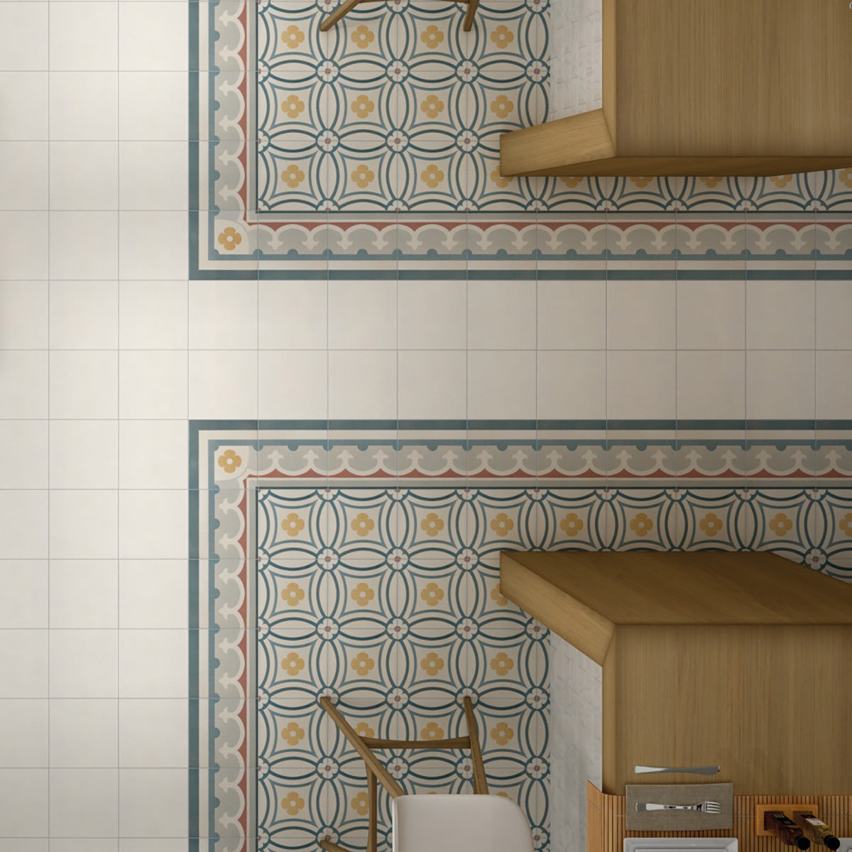 Billederne viser eksempler på, hvordan dekor-, kant- og hjørnefliser kan kombineres for at danne en helhed. Serien giver dig stor fleksibilitet til at tilpasse mønstret efter rummets størrelse og karakter – fra små områder til store gulvflader, hvor designet virkelig kommer til sin ret. Med Atelier får du et både praktisk og æstetisk gulv, der holder i mange år fremover – perfekt til dig, der ønsker at skabe en fornemmelse af århundredeskifte i hjemmet.