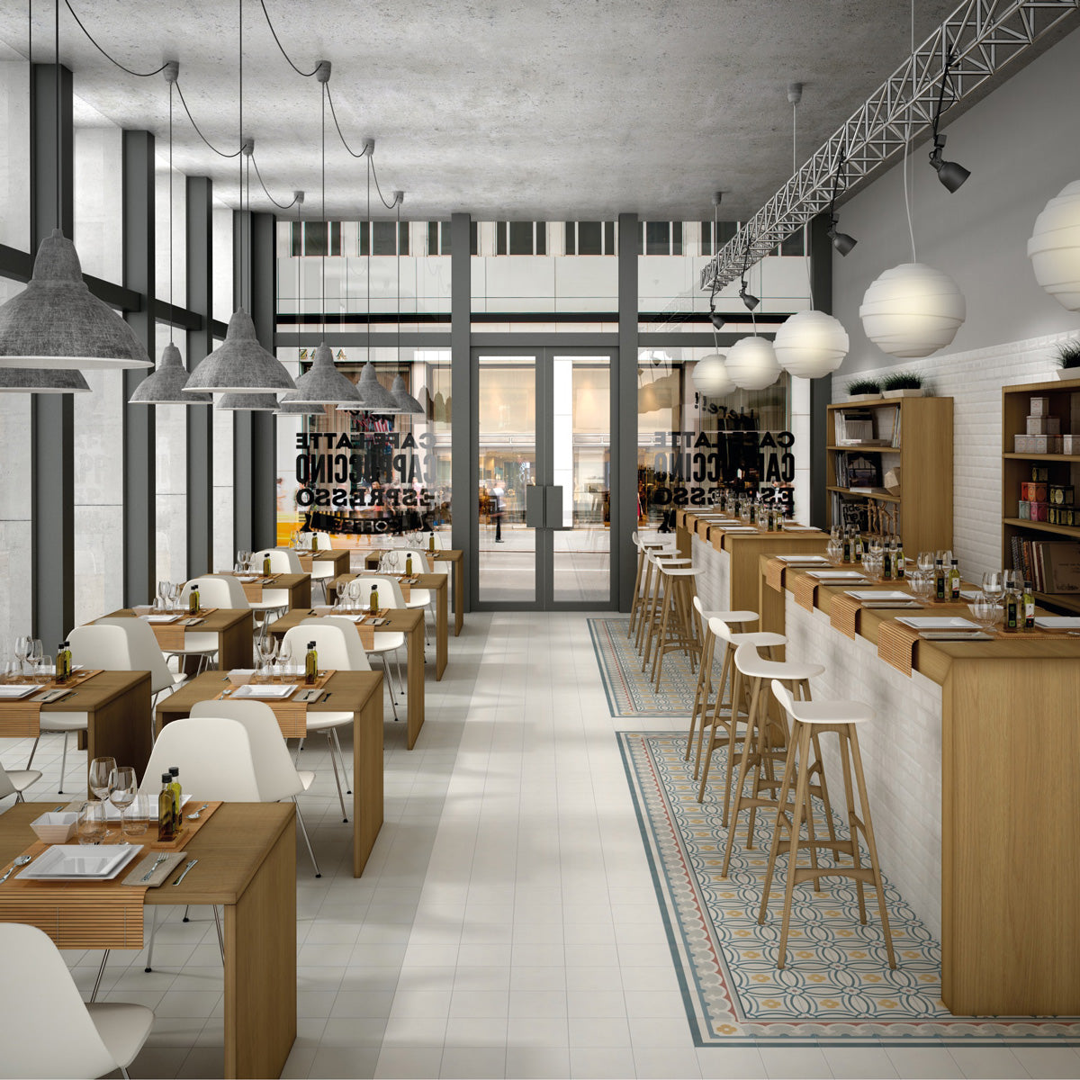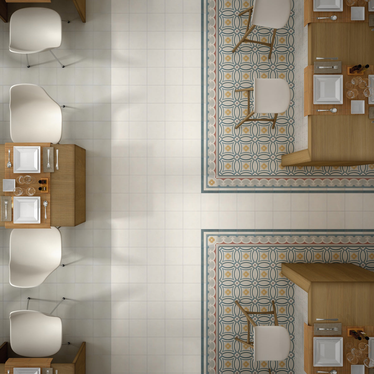 Riviera kan anvendes alene for at skabe en dekorativ overflade, men bliver særligt effektfuld, når den kombineres med seriens kant- og hjørnefliser. På den måde kan du opbygge en komplet bort eller ramme omkring mønsteret, hvilket giver en eksklusiv indramning i køkken, entré, badeværelse eller gang. Den matte overflade forstærker fornemmelsen af traditionelle cementfliser og bidrager til et autentisk udtryk.