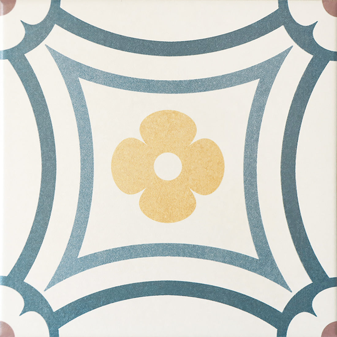 Klinker Atelier Riviera Mat 20x20 er en dekorflise i serien Atelier, der leder tankerne hen på århundredeskiftets klassiske mønstergulve. Flisen har et legende, men elegant mønster i blå, gule og røde toner på hvid baggrund. De symmetriske former og blomsterdetaljer skaber et levende udtryk, der giver gulvet karakter og en følelse af tidløs charme.