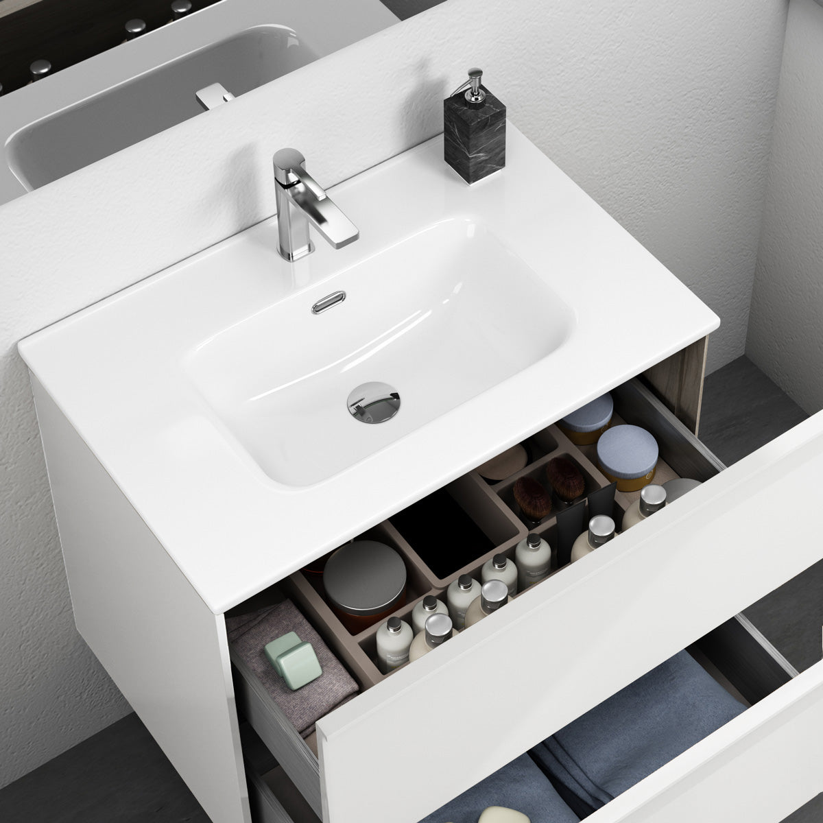 Kommoden leveres med den elegante håndvask Fjord, i porcelæn, som harmonerer perfekt med kommodens design. Håndvasken er både praktisk og æstetisk tiltalende, hvilket gør din badeværelsesoplevelse endnu bedre.