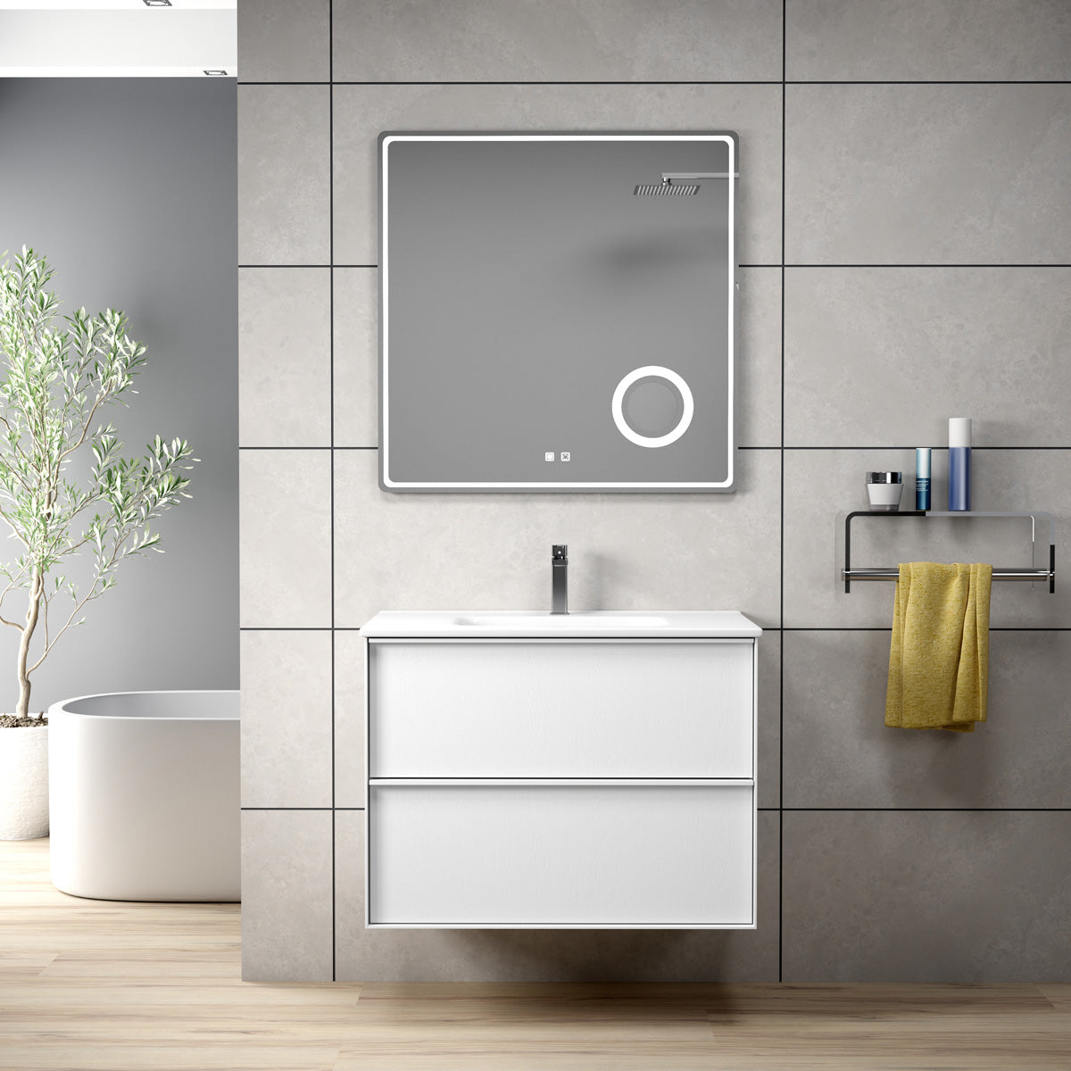 Kommoderne i serien fås i to bredder, 60 cm og 80 cm, hvilket giver fleksibilitet til forskellige badeværelsesstørrelser. Med en dybde på 46 cm og en højde på 59 cm tilbyder de rigelig opbevaringsplads uden at dominere rummet. De er udstyret med to rummelige skuffer med soft-close mekanismer, hvilket gør dem både praktiske og støjsvage. Skuffernes grebskanter, fremstillet i samme materiale og finish som resten af møblet, bidrager til et ensartet og moderne udseende.